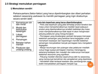 Dia mula mengambil risiko untuk memulakan perniagaan yang lain dalam usaha untuk meningkatkan taraf pendapatan keluarganya. 13 Selepas memulakan perniagaan. Faktor ketiga pula ialah keyakinan.