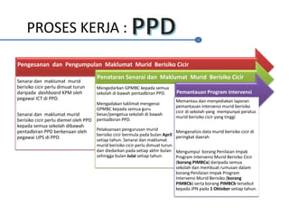 Alat permainan dan ruang rehat minda Langkah. Taklimat garis panduan mengurus murid berisiko cicir di sekolah. Pada masa sama kata beliau KPM melaksanakan intervensi murid risiko cicir pengajaran dan pembelajaran di peringkat Jabatan Pendidikan Negeri dan Pejabat Pendidikan Daerah.