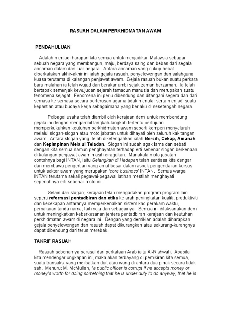 Antara punca berlakunya gejala rasuah termasuklah kurangnya didikan agama dan moral. Selain itu Presiden Kongres Kesatuan Pekerja-pekerja Dalam Perkhidmatan Awam Cuepacs Datuk Azih Muda menjelaskan pada tahun 2017 terdapat 20000 penjawat awam yang bersara awal setahun disebabkan tekanan di tempat kerja. 572 Pengukuhan Nilai Dan Profesionalisme Di Kalangan Penjawat Awam Ke Arah Efektif Governan Di Malaysia cergas industri yang memperkayakan ilmu pengetahuan yang berdaya maju51 Selain daripada itu nilai profesionalisme juga bermaksud mengambil sesuatu pertimbangan hanya dalam ruang bidang tugas52 Ini adalah untuk mengelakan penjawat.